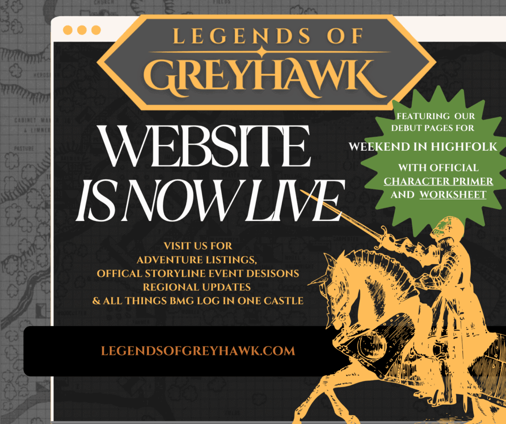 Hark, everyone of you Legends!!! BMG is excited to announce its big launch of our dedicated website for all contributions to Legends of Greyhawk organized play campaign! We are still under construction, so be sure to check back for updates, articles, and resources for all things #LOG to land here in this official place!