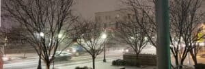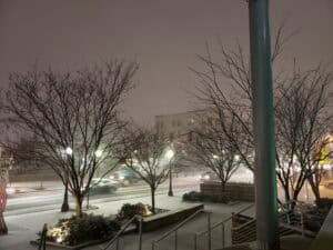 The wind has a chill as it blows leaves down the street. The trees are bare and sway in the wind. Flakes can be seen floating on the breeze and piling up against old stone walls and houses. A warm red glow emanates out from a window ahead. Laughter and merriment can be heard as the front door opens and shuts beckoning you to come in and warm your hands by the fire.